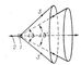 Рис. 1. Образование коаксиальных дифракционных конусов: 1 — кристалл; 2 — падающее на кристалл монохроматическое рентгеновское излучение; 3 — дифрагирующие лучи; 4J и 4J' — углы раствора дифракционных конусов.