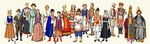 Традиционная (конец 19 в.) одежда народов, населяющих современную территорию СССР: 1 — эстонцы; 2 — латыши; 3 — литовцы; 4 — украинцы; 5 — русские: слева — одежда девушки (б. Ярославская губ.); в центре — женская одежда (б. Курская губ.); справа — мужская одежда (б. Архангельская губ.); 6 — белорусы (б. Минская губ.); 7 — молдаване; 8 — марийцы: слева — мужская одежда (б. Уржумский уезд Вятской губ.); справа — женская одежда (б. Царёво-Кокшайский уезд Казанской губ.); 9 — казахи (из зажиточных слоев; женщина — в свадебном головном уборе).