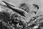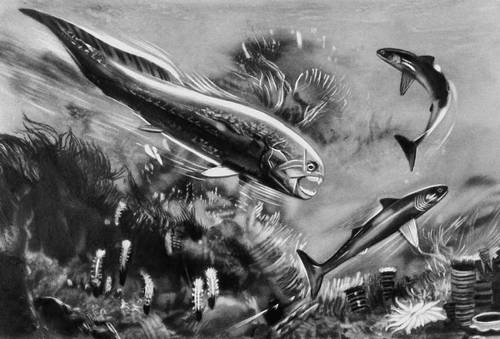 Представители морской фауны девона: слева — Dinichthys (из артродир); справа — Cladoselache (из акуловых рыб); на переднем плане — коралловые полипы.