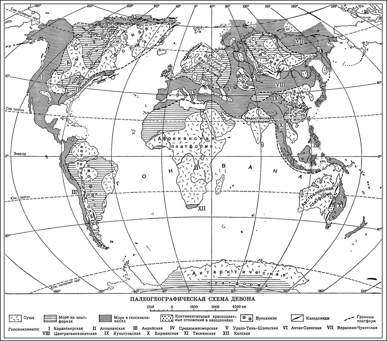 Биогеографическое районирование. Распространение основных групп морской фауны (главным образом кораллов) позволило наметить в раннем девоне следующие зоогеографические провинции: Средиземноморскую, включающую Западную и Центральную Европу, Малую Азию, Иран, Гималаи; Магрибскую (Северная Африка), Урало-Тянь-Шаньскую, Джунгаро-Балхашскую, Алтае-Саянскую, Индигиро-Колымскую (Таймыр, С.-В. СССР), Монголо-Охотскую (Восточное Забайкалье, бассейн Амура), Индо-Синийскую (Индокитай, Юго-Западный Китай), Восточно-Австралийскую, Калифорнийско-Канадскую, Аппалачскую, Мальвино-Кафрскую (южные части Южной Америки и Африки). В среднем девоне расширяются связи между этими провинциями и различия их постепенно становятся региональными. В позднем девоне выявляются лишь Северо-Американская и Австрало-Евразиатская провинции. В Д. п., по-видимому, обособляются и фитогеографические провинции.
