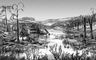 Ландшафт среднего девона с представителями псилофитовой флоры, плауновидных, членистостебельных и папоротниковидных типов растений.