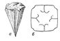 Конулярии: а — внешняя форма; б — поперечное сечение (схема).