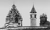 Кижи. Общий вид ансамбля. Слева направо: Преображенская церковь (1714), колокольня (1874), Покровская церковь (1764).