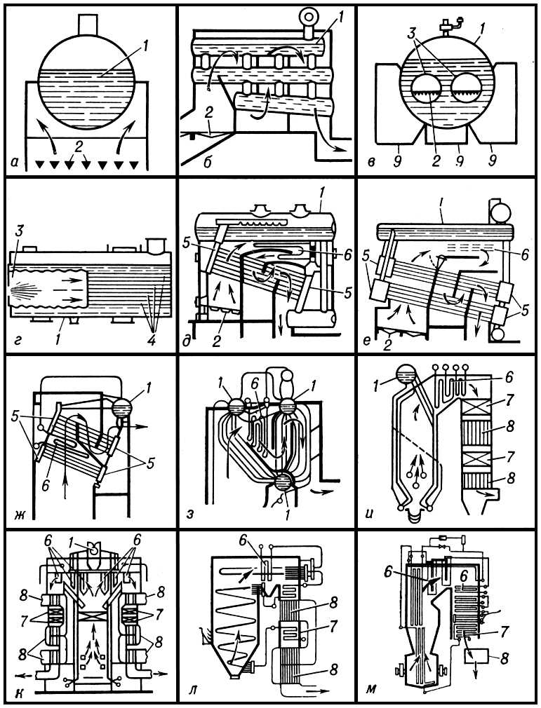 Рис. 2. Конструкции паровых котлов: а — цилиндрический; б — батарейный; в — жаротрубный; г — жаротрубно-дымогарный (локомобильный); д — камерный горизонтально-водотрубный; е — камерный горизонтально-водотрубный конструкции В. Г. Шухова; ж — двухсекционный горизонтально-водотрубный («морской»); з — вертикально-водотрубный с гнутыми трубами; u — вертикально-водотрубный с П-образной компоновкой; к — вертикально-водотрубный с Т-образной компоновкой; л — прямоточный конструкции Л. К. Рамзина; м — прямоточный котёл ТПП-210А (СССР): 1 — барабан; 2 — колосниковая решётка; 3 — жаровая труба; 4 — дымогарная труба; 5 — сборная камера; 6 — пароперегреватель; 7 — водяной экономайзер; 8 — воздухоподогреватель; 9 — газоход.