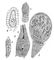 Рис.2. Развитие зародыша у растений разных систематических групп. У мохообразных (Conocephalum conicum): a — зигота, б — первое деление зиготы горизонтальной перегородкой, в — образование поперечных перегородок, г — апикальный и базальный концы зародыша, дифференциация археспориальной ткани, д — зрелый зародыш, ставший спорогонием.