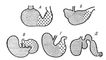 Рис. 3. Схемы строения желудка собаки (А), крысы (Б), хомяка (В), лошади (Г) и жвачного (Д). Многослойный эпителий пищевода и пищеводного отдела желудка отмечен поперечными штрихами, область кардиальных желёз — косыми штрихами, область желёз дна желудка — пунктиром, область пилорических желёз — крестиками.