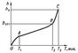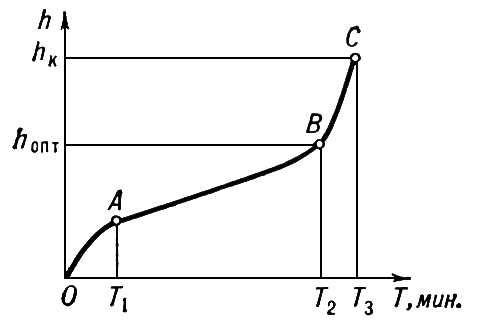 Рис. 4. Характер изнашивания задней поверхности режущего инструмента: OA — период приработки; AB — период рабочего изнашивания; ВС — период катастрофического изнашивания.