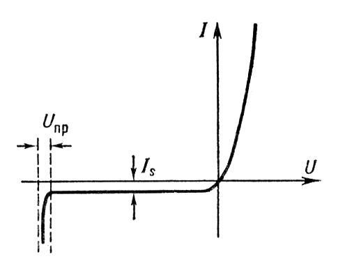 Рис. 2. Вольтамперная характеристика р — n-перехода: U — приложенное напряжение; I - ток через переход; Is — ток насыщения; Unp — напряжение пробоя.