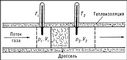 Рис. 1. Схема опыта Джоуля — Томсона. В теплоизолированной трубке создаётся стационарный проток газа. После прохождения газа через дроссель его давление p, уд. объём V и температура Т изменяются.