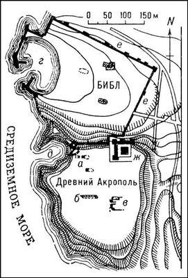Джубейль (Древний Библ). План: а — царские гробницы; б — сирийский храм; в — египетский храм; г — древний порт; д — старая бухта; е — средневековые стены; ж — феодальный замок.