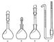 Рис. 1. Пикнометры по ГОСТу 7465—67: а — колбообразный с меткой и глухой притёртой пробкой (для жидкостей); б — колбообразный с капиллярным отверстием в пробке (для жидкостей); в — колбообразный со съёмной горловиной (для твёрдых веществ); г — U-oбразный капиллярный (для летучих жидкостей).