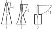 Рис. 2. Волноводные резонансные акустические концентраторы: 1 — конический, 2 — экспоненциальный, 3 — ступенчатый, x — распределение амплитуды колебаний.