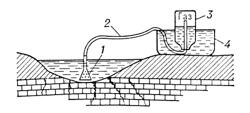 Рис. 3. Отбор пробы и измерение дебита газа при выделении его на дне водоёмов: 1 — воронка; 2 — резиновая трубка; 3 — сосуд известной ёмкости; 4 — сосуд с водой.