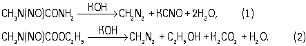 Д. получают обычно действием щёлочи на нитрозометилмочевину (1) или нитрозометилуретан (2):