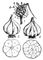 Чеснок. 1 — соцветие стрелкующегося чеснока; а — воздушная луковичка; б — цветок; 2 — луковица и её разрез у стрелкующейся формы; 3 — луковица и её разрез у нестрелкующейся формы.