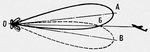Рис. 4. Схема пеленгации по методу сравнения: ОБ — равносигнальное направление; ОА и 0B — 2 положения максимума диаграммы направленности.