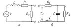 Двухполюсники: а — активный; б — пассивный; L — индуктивность; С — ёмкость; R1, R2, — омические сопротивления; е — источник тока; U — приложенное напряжение; I — электричесий ток.