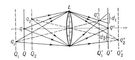 Отображение линзой L точек пространства, лежащих в расположенных на различных расстояниях от линзы плоскостях: Q — плоскость наводки, Q' — плоскость фокусировки. Точка Q резко отображается в плоскости Q', а точки q1 и q2 — в плоскостях Q'1 и Q'2. В плоскости фокусировки Q' точки q1 и q2 отображаются кружками рассеяния диаметром соответственно d1 и d2.