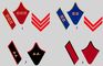 Знаки различия, введённые 3 декабря 1935 (петлицы и нарукавные знаки. Цвет поля петлиц и канта — по роду войск): 1. Старший лейтенант (пехота). 2. Лейтенант (кавалерия). 3. Отделённый командир (артиллерия). 4. Красноармеец (пехота).