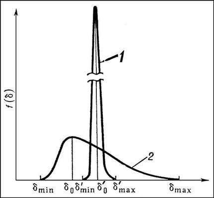 Кривые распределения объёма (массы) частиц по размерам: 1 — монодисперсная система; 2 — полидисперсная система. dmin, dmax, d0 — соответственно минимальный, максимальный и вероятнейший размер частиц; f(d) — функция распределения, доля объёма (или массы) дисперсной фазы, которая приходится на частицы с данным интервалом размеров, делённая на величину интервала.