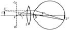 Рис. 1. Ход лучей при рассматривании небольшого предмета l в лупу L. Предмет помещают в непосредственной близости от фокальной плоскости лупы OO1. Лучи, исходящие из точки S предмета, собираются в точке S" на сетчатке глаза. В этой же точке собирались бы лучи от точки S', если бы лупы не было (точка S' — мнимое изображение точки S).