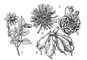 Георгина: 1 — листья и цветок немахровой формы; 2 — клубни; 3 — соцветие: а — кактусовидное, б — шаровидное.