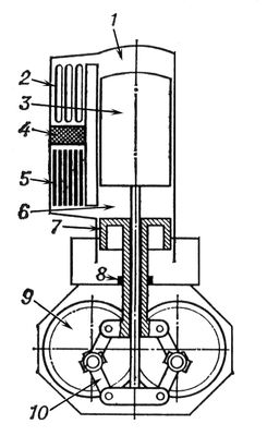 Рис. 1. Схема двигателя внешнего сгорания: 1 — горячая полость; 2 — нагреватель; 3 — поршень-вытеснитель; 4 — регенератор; 5 — охладитель; 6 — холодная полость; 7 — рабочий поршень; 8 — наружное уплотнение; 9 — зубчатые колеса, синхронизирующие работу поршней; 10 — ромбический механизм.
