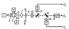 Схема камеры с бегущим лучом: 1 — усилитель импульсов для гашения обратного хода электронного луча кинескопа; 2 — фокусирующая система; 3 — отклоняющая система; 4 — генераторы строчной и кадровой развёрток; 5 — проекционный кинескоп; 6 — источник постоянного высокого напряжения; 7 — объектив; 8 — устройство для продвижения киноленты; 9 — кадровое окно; 10 — конденсорная линза; 11, 12 — дихроические полупрозрачные зеркала; 13, 14, 15 — светофильтры; 16, 17, 18 — фотоэлектронные умножители. ER , EG и EB — видеосигналы соответственно красной, зелёной и синей составляющих цвета.