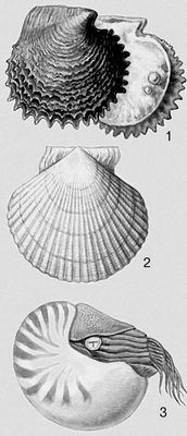 Моллюски. 1 — Pinctada margaritifera; 2 — Mizuhopecten yessoensis; 3 — Nautilus pompilius.