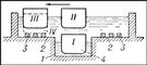 Рис. 2. Схема поперечного сечения наливного дока: 1 — канал; 2 — площадка; 3 — опоры для судов; 4 — судно (римские цифры — последовательные позиции судна при постановке в док).