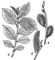 Бредина: а — ветвь с листьями; б — серёжка с пестичными цветками; в — серёжка с тычиночными цветками.