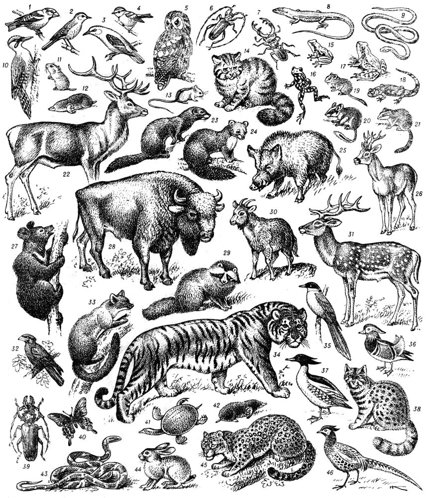 Представители фауны европейских и дальневосточных широколиственных лесов: 1 — дубонос; 2 — обыкновенный соловей; 3 — обыкновенная иволга; 4 — лазоревка; 5 — обыкновенная неясыть; 6 — дубовый усач; 7 — жук-олень; 8 — зелёная ящерица; 9 — медянка; 10 — зелёный дятел; 11 — рыжая полёвка; 12 — обыкновенный крот; 13 — лесная мышовка; 14 — лесной кот; 15 — обыкновенная квакша; 16 — краснобрюхая жерлянка; 17 — травяная лягушка; 18 — пятнистая саламандра; 19 — орешниковая соня; 20 — садовая соня; 21 — лесная соня; 22 — благородный олень; 23 — европейская норка; 24 — лесная куница; 25 — кабан; 26 — европейская косуля; 27 — белогрудый медведь; 28 — зубр; 29 — енотовидная собака; 30 — горал; 31 — пятнистый олень; 32 — восточный широкорот; 33 — харза; 34 — уссурийский тигр; 35 — голубая сорока; 36 — мандаринка; 37 — чешуйчатый крохаль; 38 — бенгальский кот; 39 — реликтовый дровосек; 40 — махаон Маака; 41 — дальневосточная мягкая черепаха; 42 — большая могера; 43 — амурский полоз; 44 — мяньчжурский заяц; 45 — леопард; 46 — фазан.