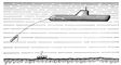 Рис. 2. Постановка лодочной мины (донной) с подводной лодки: 1 — мина выстрелена из трубы торпедного аппарата; 2 — мина погрузилась на дно.