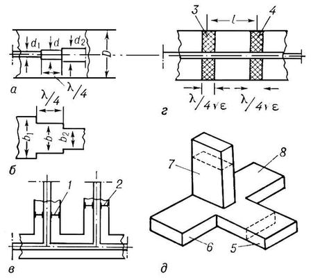 Рис. 1. Трансформаторы СВЧ: четвертьволновые с фиксированным сопротивлением — коаксиальный (а) и волноводный (б); перестраиваемые — коаксиальный двухшлейфовый (в), коаксиальный с диэлектрическими втулками (г); волноводный на основе двойного тройника (д); 1, 2 — перемещаемые поршни; 3, 4 — перемещаемые диэлектрические втулки; 5 — Н-плечо; 6 — вход трансформатора; 7 — Е-плечо; 8 — вход трансформатора; D — диаметр наружного проводника коаксиальной линии; d1, d2 и d — диаметры внутреннего проводника коаксиальной линии соответственно со стороны генератора, нагрузки и на трансформаторном участке; b1, b2 и b — размеры меньшей стороны поперечного сечения прямоугольного волновода соответсвенно со стороны генератора, нагрузки и на трансформаторном участке; l — расстояние между центрами диэлектрических втулок; l — рабочая длина волны в линии; e — диэлектрическая проницаемость; пунктирными прямоугольниками отмечено положение перемещаемых поршней в Е- и Н- плечах тройника.