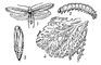 Капустная моль: 1 — бабочка; 2 — гусеница; 3 — куколка; 4 — лист капусты, поврежденный капустной молью.