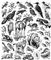 Представители таёжной фауны: 1 — щур; 2 — клёст-еловик; 3 — кукша; 4 — трёхпалый дятел; 5 — желна; 6 — обыкновенный гоголь; 7 — обыкновенный свиристель; 8 — обыкновенная чечётка; 9 — кедровка; 10 — снегирь; 11 — каменный глухарь; 12 — дикуша; 13 — рябчик; 14 — воробьиный сыч; 15 — длиннохвостая неясыть; 16 — кабарга; 17 — росомаха; 18 — обыкновенная бурозубка; 19 — соболь; 20 — лесной лемминг; 21 — северная пищуха; 22 — тёмная полёвка; 23 — красно-серая полёвка; 24 — красная полёвка; 25 — летяга; 26 — бурундук; 27 — лось; 28 — рысь; 29 — бурый медведь; 30 — северный кожанок; 31 — колонок; 32 — живородящая ящерица; 33 — обыкновенная гадюка; 34 —таёжный клещ; 35 — еловый дровосек; 36 — сибирский шелкопряд и его гусеница (а).