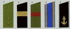 Погоны военнослужащих Советской Армии и Военно-Морского Флота. К повседневному и полевому обмундированию: 1. Прапорщик. 2. Старший сержант. 3. Младший сержант. 4. Курсант воен. училища (рядовой). 5. Курсант военно-морского училища.