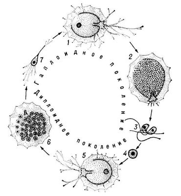 Рис. 2. Жизненный цикл однокамерной фораминиферы Iridia lucida: 1 — одноядерный гамонт; 2 — формирование гамет в гамонте; 3 — копуляция жгутиковых изогамет (сильно увеличено); 4 — зигота; 5 — агамонт (одноядерный); 6 — формирование агамет в агамонте; 7 — молодой гамонт.