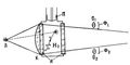 Рис. 1. Схема водородной пузырьковой камеры; корпус камеры заполнен жидким водородом (Н2); расширение производится с помощью поршня П; освещение камеры на просвет осуществляется импульсным источником света Л через стеклянные иллюминаторы И и конденсатор К; свет, рассеянный пузырьками, фиксируется с помощью фотографических объективов О1 и О2 на фотопленках Ф1 и Ф2.
