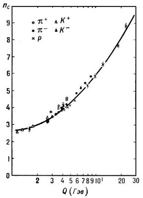 Рис. 2. Среднее число вторичных заряженных частиц nс как функция кинетической энергии Q сталкивающихся частиц в системе их центра инерции. Разными значками обозначены результаты, относящиеся к рассеянию p±-, К±-мезонов и протонов на нуклонах.