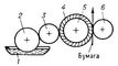 Ñõåìà ïå÷àòíîé ñåêöèè ôëåêñîãðàôñêîé ìàøèíû: 1 — êðàñêà; 2 — ïåðåäàòî÷íûé âàëèê; 3 — íàêàòíûé êðàñî÷íûé âàëèê; 4 — ðåçèíîâàÿ ôîðìà; 5 — ôîðìíûé öèëèíäð; 6 — ïå÷àòíûé öèëèíäð.
