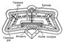 Ðèñ. 1. Òèï ôîðòà ñ îäíèì âàëîì: à — ñðåäíèé êàçåìàòèðîâàííûé òðàâåðñ; á — êàçåìàòèðîâàííûå òðàâåðñû; â — ïîòåðíà ïîä âàëîì; ã — ïîëóêàïîíèðû; ä — ôëàíêè êàçåìàòèðîâàííîé êàçàðìû.