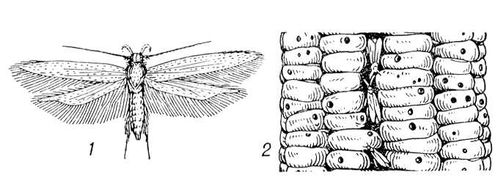 Амбарная зерновая моль: 1 — бабочка; 2 — часть початка кукурузы с бабочками и выходными отверстиями в зёрнах.