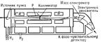 Рис. 2. Схема эксперимента по наблюдению магнитного резонанса в молекулярном пучке. Пролёт частицы через прибор определяется по искривлению её траектории; отклонения увеличены относительно типичных размеров прибора (длина прибора 3 м, максимальное поперечное сечение 0,01 см). Р — резонатор, в котором возбуждается электромагнитное поле резонансной частоты; H1 — форвакуумный насос, H2 — высоковакуумный насос; А, В и С — электромагниты.