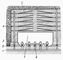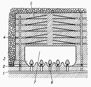Рис. 8. Система этажного принудительного обрушения: 1 — выработки откаточного горизонта; 2 — скреперные выработки; 3 — выпускные воронки; 4 — материально-ходовые восстающие; 5 — скважины; 6 — рудоспуски; 7 — компенсационная камера.