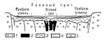 Îñíîâíûå ýëåìåíòû ðåëüåôà äíà è ãëóáèííîå ãåîëîãè÷åñêîå ñòðîåíèå: 1 — ãðàíèòû; 2 — áàçàëüòû; 3 — îñàäî÷íûå ïîðîäû; 4 — íåêîìïåíñèðîâàííûå îñàäêè; 5 — âûõîäû þâåíèëüíûõ âîä.