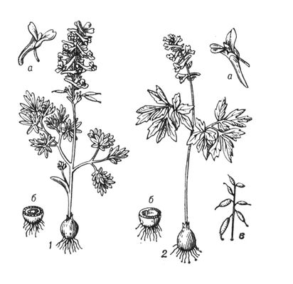 1 — хохлатка плотная: а — цветок, б — клубень в поперечном разрезе; 2 — хохлатка полая: а — цветок, б — клубень в поперечном разрезе, в — плоды.