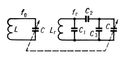 Принципиальная схема одного из контуров, содержащихся во входной цепи и в усилителе радиочастоты, и контура гетеродина: L и Lr — катушки индуктивности контуров; С — конденсаторы переменной ёмкости; C1, С2, С3 — конденсаторы сопряжения; fo и fr — резонансные частоты контуров; пунктир означает, что ёмкости конденсаторов изменяются при помощи одной ручки настройки.