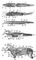 Поверхностная мускулатура позвоночных животных: А — минога (круглоротое), Б — акула (рыба), В — протей (земноводное), Г — гаттерия (пресмыкающееся), Д — кошка (млекопитающее): 1 — жаберные щели; 2 — рот; 3 — наджаберная мускулатура; 4 — поджаберная мускулатура; 5 — туловищные миомеры; 6 — брызгальце; 7 — мышца, поднимающая нёбно-квадратный хрящ; 8 — мышца, приводящая нижнюю челюсть; 9 — общий сжиматель висцерального аппарата (дорзальный — сверху и вентральный — снизу); 10 — спинная мускулатура; 11 — брюшная мускулатура; 12 — мышца, поднимающая грудной плавник; 13 — опускающая его; 14 — поднимающая нижнюю челюсть; 15 — опускающая её; 16 — нижнечелюстная мышца; 17 — трапециевидная; 18 — дельтовидная; 19 — коракоидно-плечевая; 20 — двуглавая; 21 — разгибатели предплечья; 22 — трёхглавая; 23-25 — мышцы живота (23 — наружная косая; 24 — внутренняя косая; 25 — прямая); 26 — сжимающая шею; 27 — поперечно-остистые; 28 — длинная мышца спины; 29 — подвздошно-крестцовые; 30 — грудная; 31 — височная; 32 — жевательная; 33 — двубрюшная; 34 — грудино-сосцевидная; 35 — надостистая; 36 — подостистая; 37 — поднимающая лопатку; 38 — трёхглавая плеча; 39 — нижние зубчатые; 40 — широкая мышца спины; 41 — портняжная; 42 — напрягающая фасцию бедра; 43 — средняя и большая ягодичные; 44 — полусухожильная; 45 — двуглавая бедра; 46 — икроножная.