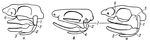 Рис. 3. Отношение передних висцеральных дуг к осевому черепу: а — гиостильный череп акулы; б — аутостильный череп наземного позвоночного (лягушка); в — амфистильный череп акулы; 1 — подвесок, 2 — гиоид, 3 — меккелев хрящ, 4 — нижняя челюсть, 5 — задний ушной отросток, 6 — нёбный отросток, 7 — нёбноквадратный хрящ.